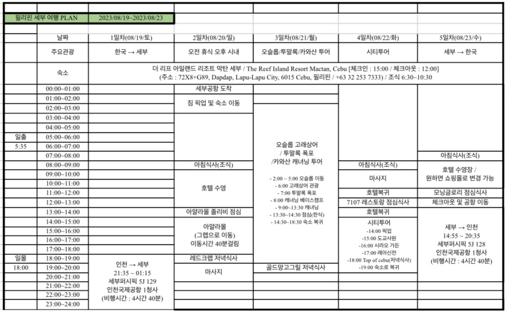 5일 차 : 세부에서 한국으로 돌아가는 비행시간은 보통 점심 시간대인 오후 14시 비행기가 많습니다. 비행시간 전 짐정리 및 간단한 기념품 구매를 추천드립니다.
